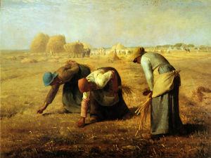 下のミレーの「落穂ひろい」のように下に落ちた物拾う体勢ですね。
